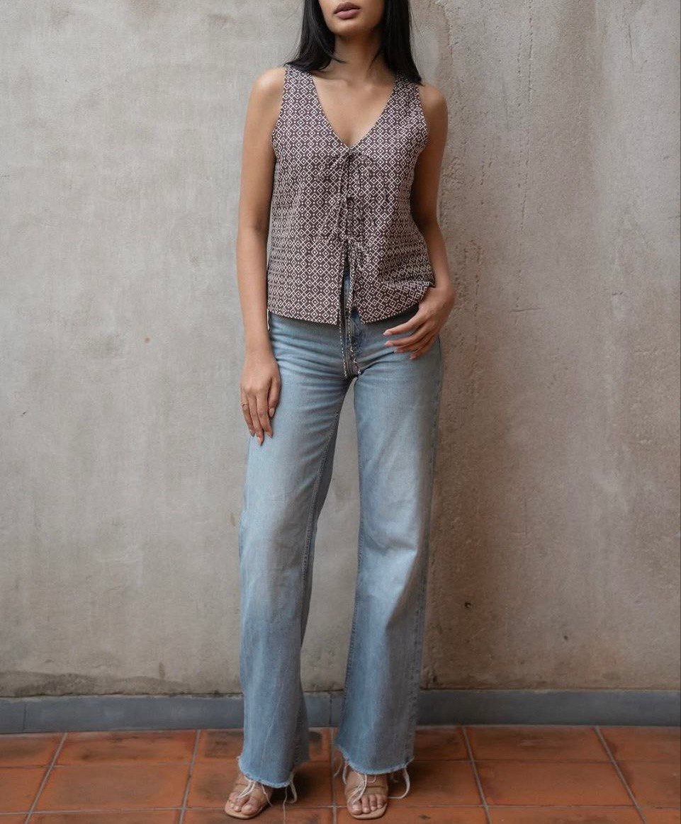 This Boho top-inspired geometric print in earthy brown and white tones. The standout detail is the lace-up front. Made from a lightweight, breathable fabric, this top offers both comfort and style.