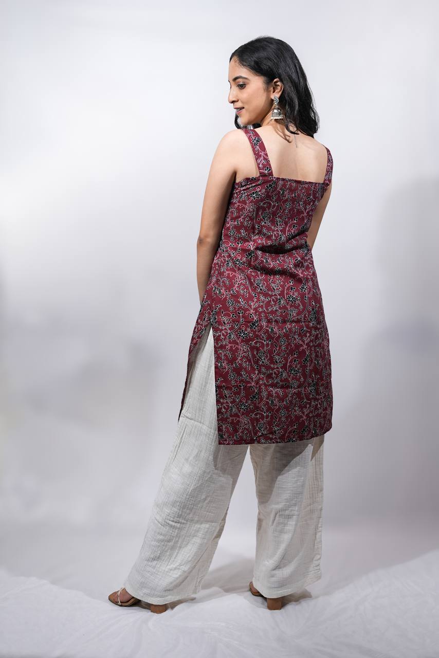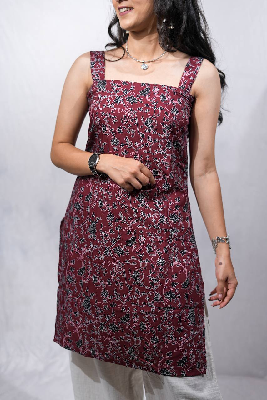 The Kaya sleeveless long Kurti, This sleeveless long kurti features broad shoulder straps and a straight-cut silhouette, bringing together comfort and chic style in perfect harmony. It’s the ultimate go-to for summer brunches, art fairs, or weekend getaways.