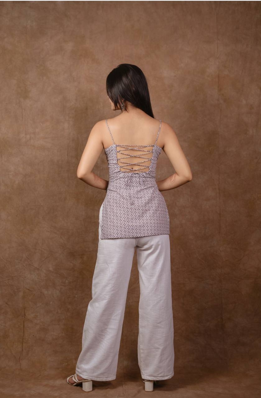 Step into effortless elegance with this Sahiba noodle strap corset Kurti, where minimalism meets bold design. The standout lace-up back detail adds a playful, contemporary edge, while the delicate micro block prints bring in a hint of ethnic charm. Designed with fine spaghetti straps and a breezy straight silhouette, this kurti is perfect for those who love comfort without compromising on style.