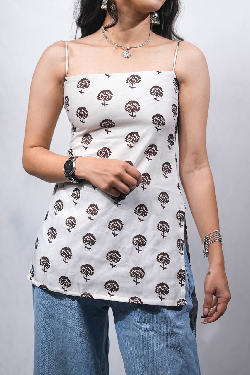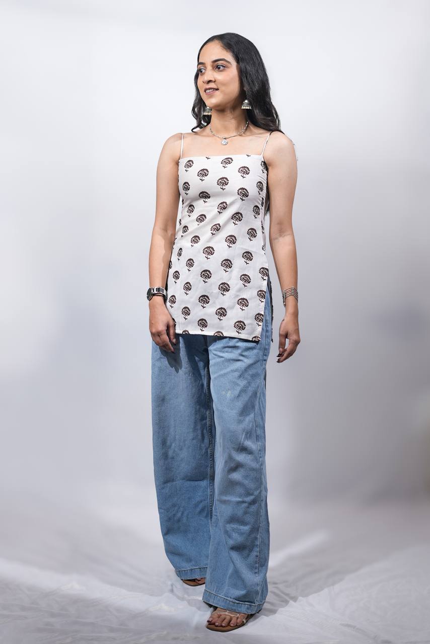 Meet, the Selin Spaghetti Strap Kurti is a perfect blend of comfort and contemporary design. Made from breathable cotton, this ivory-white kurti is adorned with hand block-style tree motifs in deep brown, evoking a calm, earthy vibe.